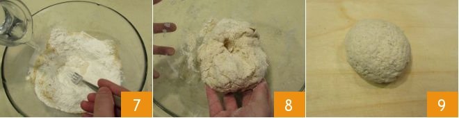 Gradually pour in the lukewarm water 7 and knead vigorously to combine the ingredients 8, forming a compact dough ball 9