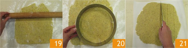 After the resting time, roll out the dough on a lightly floured surface to a thickness of about 1/8 inch 19. Cut the dough with a ring mold with a diameter of 8.5 inches and a height of 1.2 inches 20, then cut strips from the remaining dough slightly wider than the height of the ring 21.