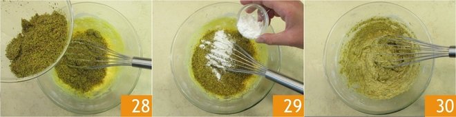 Add the pistachio flour 28, salt, and cornstarch 29, then incorporate the dry ingredients with the whisk 30. Transfer the cream to a piping bag and set aside.