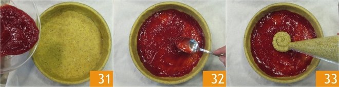 Now retrieve the pastry and spread a thin layer of strained raspberry jam on the base 31 32, then add the frangipane cream 33.