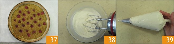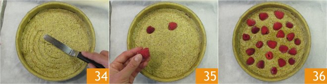 Spread the cream evenly with a spatula up to a few millimeters from the edge 34, then embed the raspberries by pressing gently 35. Bake in a preheated fan oven at 320°F for 30 minutes 36.
