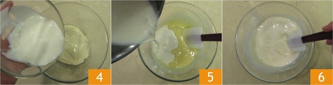 In a separate bowl, mix the yogurt with the melted chocolate 4, then add the still-warm milk in several additions 5, blending well with a spatula 6.