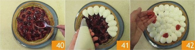 When the tart is cool, spread a thin layer of raspberry jam on top 40, then cover everything with dollops of namelaka 41 and garnish with some fresh raspberries 42.