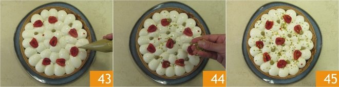 Finish the decoration with dots of pistachio cream 43 and chopped pistachios 44. Your pistachio tart with yogurt namelaka cream is ready to be served 45!