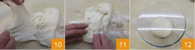 Start working it by hand for a few minutes, making folds: pull the edges of the dough 10 and fold them towards the inside 11. This operation is needed to make these types of very hydrated doughs more elastic and workable. If possible, for each fold, let the dough rest for a few minutes covered with plastic wrap and then continue making folds. Then form a ball with the dough and place it in a large bowl; cover with plastic wrap 12 and let it rise in the oven with the light on for about 3 hours (at a maximum temperature of 82-86°F): the dough should double in volume. The dough should then be transferred to the refrigerator and left to rise overnight, still in the bowl covered with plastic wrap.