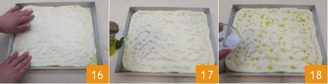 taking care to extend it until it covers the entire surface 16. Once finished, let the pizza rise for another 30-60 minutes, then season with about 2 tsps of extra virgin olive oil 17 and coarse salt sprinkled over the entire surface 18. Bake the pizza in a preheated static oven at 430°F for 20 minutes: the pizza should be soft on top and more crispy at the base (if you have a gas oven, you can place the tray in the lowest part of the oven). To achieve an even closer result to the original Roman pizza, you can heat the tray you will use for baking, without oiling it, until it becomes red-hot, and with a spatula, place the dough, stretched by hand, directly on the paddle.