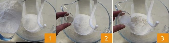 To prepare pizza and mortadella, start with the pizza dough: in a planetary mixer with a hook (you can also knead by hand, it will take much longer for the dough to become smooth and homogeneous), pour the sifted flour 1. Then add the dry yeast 2 and granulated sugar 3.
