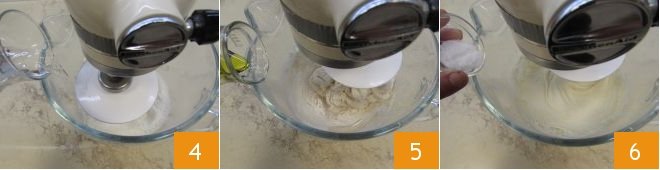 Start working the powders, then gradually pour in the lukewarm water 4, and when it has absorbed, also gradually pour in the olive oil 5. Continue working the dough with the hook until it becomes homogeneous and finally add the salt 6.