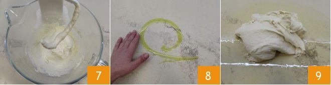 Work the dough for at least fifteen minutes, then stop the mixer 7: the dough will be very hydrated and soft. At this point, oil the work surface with about 1 tsp of oil 8 and also oil your hands well so that you can work the dough well. Now transfer the pizza dough to the oiled work surface 9.