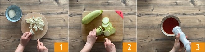 To prepare pizzaiola zucchini, first cut the mozzarella into small cubes 1 and let it drain. Wash the zucchinis, trim the ends, and cut them into rounds, about 1/4 inch thick 2. Pour the tomato sauce into a bowl, season it with salt 3, olive oil, and chopped basil leaves.