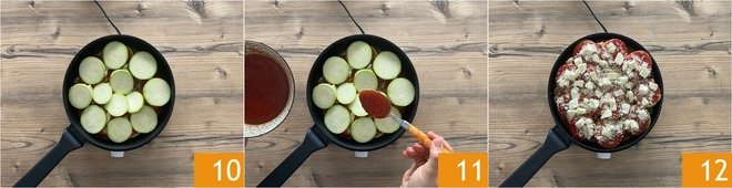 Continue in this manner, alternating ingredients until you finish the zucchini 10. Add more tomato sauce on top 11, a bit more Parmesan, and the remaining mozzarella 12. Cook for 40 minutes, then serve.