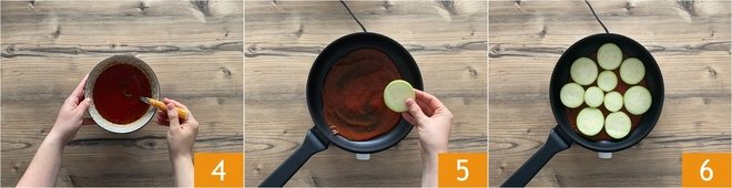 Mix well 4. Take a 9.5-inch non-stick pan and place a few tablespoons of tomato sauce on the bottom. Arrange the zucchini inside 5, covering the entire surface 6.