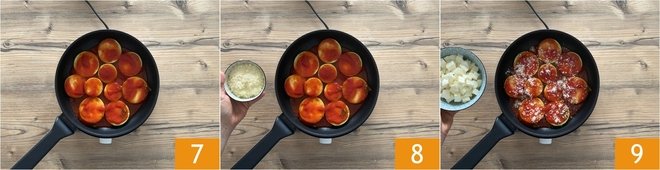 Add a little more tomato sauce on top 7, a tablespoon of grated Parmesan 8, and some mozzarella cubes 9.