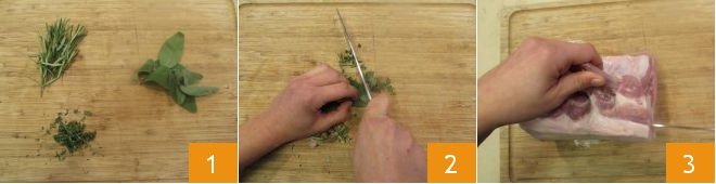To prepare pork loin roast, start by taking a part of the aromatic herbs: thyme, rosemary and sage (leave the remaining part to one side) 1; coarsely chop the herbs on a cutting board 2. Now place the pork loin on the cutting board and cut a flap into it using a sharp-edged knife 3,