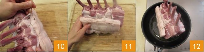 After running the twine around the last part 10, form a loop and hold it down with your fingers. Run the end of the twine through the loop a couple of times, then the meat, tighten and tie the last knot 11. Once you have tied the meat, you can cook it. Heat a drizzle of oil in a non-stick pan and add the pork loin roast when hot 12.