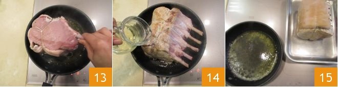 Brown thoroughly on all sides 13 without burning it, to seal the pores of the meat, so that all the juices remain inside. When nice and golden, add the white wine 14, which will enrich the naturally sweet pork with a touch of acidity. Wait a few moments, then use a pair of tongs to place the meat cut in a baking tray; leave the baking sauce to one side 15.