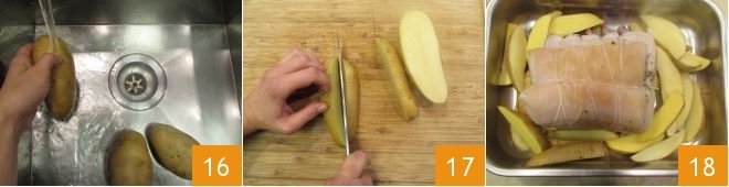 Now thoroughly wash the potatoes 16 and dry them with a cloth. Cut them in half and then into slices, all the same size if possible 17. Place them in the tray 18 and add a little salt. You won't need to add any oil because as the pork loin cooks its casing will melt and flavor the potatoes. Bake in the oven at 355°F (180°C) for around 15 minutes.
