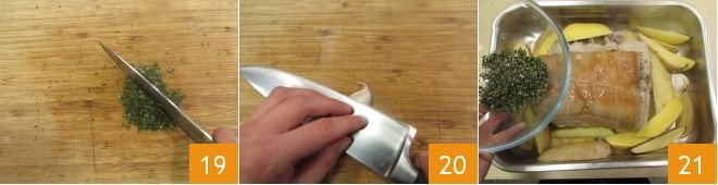 In the meantime, finely chop the aromatic herbs you saved for later 19, then gently crush an unpeeled garlic clove 20. Once the 15 minutes are up, remove the meat from the oven, add the garlic clove and the aromatic herbs 21.