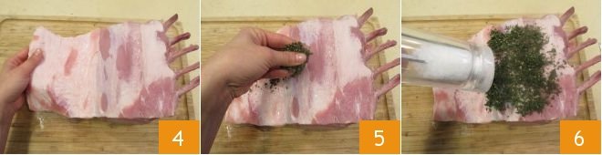 without entirely detaching it from the meat cut. Now open it out 4 and place the previously chopped herbs inside 5; season with salt 6 and pepper.