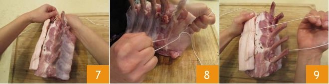 Close the flap and tie the roast, to hold it together and give shape to your meat cut. Run a piece of kitchen twine under 7 and then over the meat lengthwise; be sure to tie both ends with a knot 8 and leave a part of the twine slightly longer than the other. Run the longer piece of twine back to the opposite end and tie one last knot so that the twine does not come undone. In this way the casing will stick nicely to the meat cut. Now continue to cage the meat by running the twine up and down the sides 9.