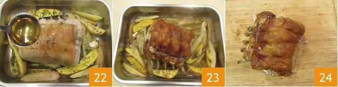 Pour the broth into the tray, around the meat cut 22 and place back in the oven at 355°F (180°C); you'll need a thermometer to know exactly when it is done. The temperature in the middle of the meat should be 143°-149°F (60°-65°C). Cooking times vary according to the size of the meat cut used, but it should take around 40-50 minutes. Remove the tray from the oven 23 and place the meat alone on a cutting board 24.