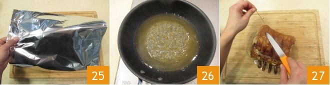 Cover with a sheet of aluminum foil 25 and leave the meat to rest for 3-4 minutes; according to the size of the meat cut, the temperature inside could increase by 36°-41°F (2°-5°C). In the meantime, reduce the baking sauce you left to one side on a low flame 26. Now untie the meat 27 and be sure to remove all the twine.