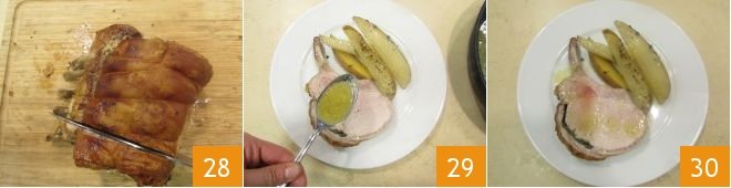 Cut it into slices, according to where the bones are 28. Now place the meat and potatoes on a plate and pour the baking sauce over them 29. The pork loin roast is ready to be served 30!