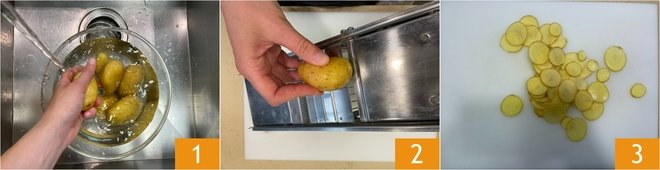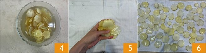 Repeat this process for the rest of the potatoes. The water will quickly become cloudy due to the starch in the potatoes, so change it at least three times before leaving the slices to soak for an hour 4. At this point, drain them and transfer them to a clean, dry dish towel 5. Spread them out evenly 6.