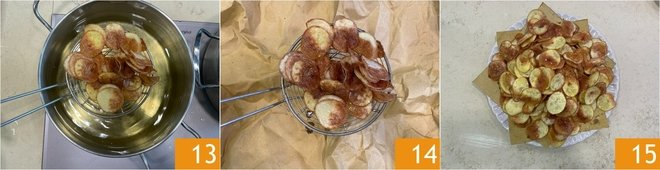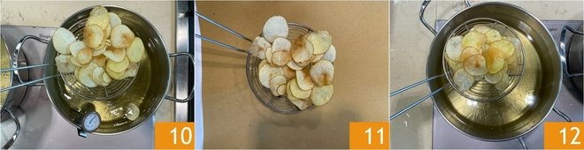 Remove them with a slotted spoon 10 and transfer them to a tray lined with paper towels 11. Cook the rest in this manner, then increase the oil temperature to 355°F (180°C) and immerse the potato slices again 12.