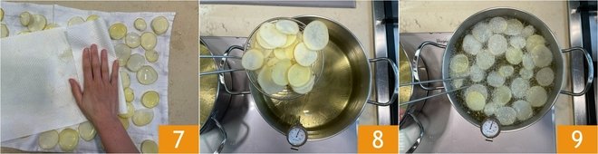 Pat them dry with kitchen paper 7. Dry them thoroughly to prevent the oil from 'exploding' and splattering when the potatoes are immersed. Heat the oil to 285°F (140°C). Immerse the potato slices in the hot oil, a few at a time 8. Cook them for a couple of minutes 9.