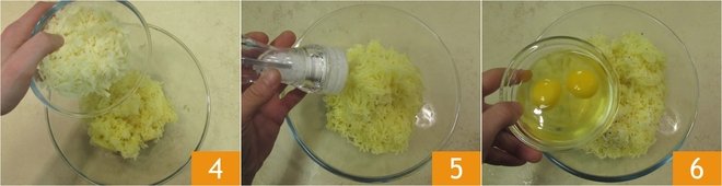 Add the caciocavallo 4, salt 5, pepper, and eggs 6.