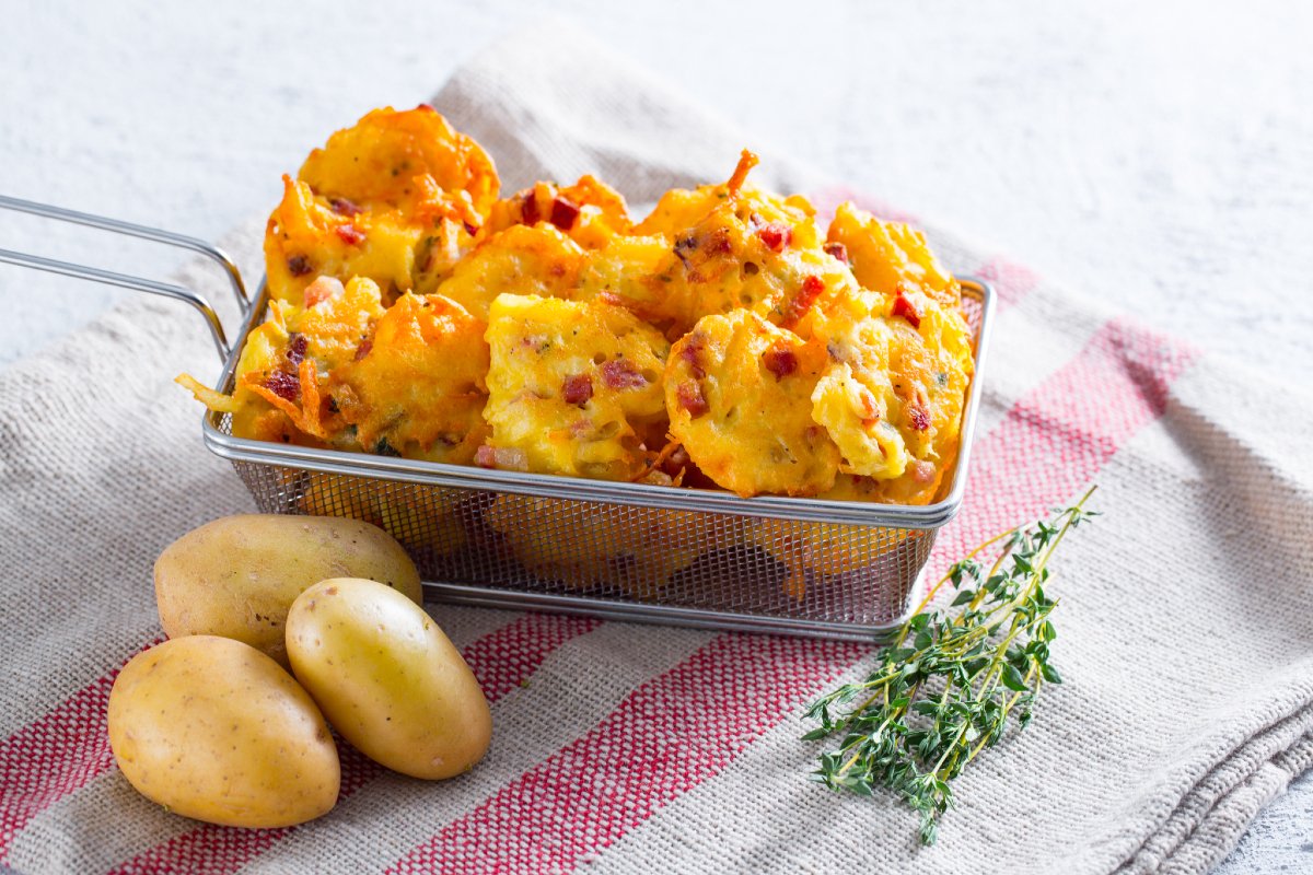 Did someone say Luna-Park Fritters? We go crazy for those apple ones, but it's equally impossible to resist the savory version with zucchini or, as we show you today, with potatoes! The potato and speck fritters are tasty fried bites, the perfect appetizer finger food for your home happy hours. Crunchy and golden on the outside and soft on the inside, these fritters are excellent enjoyed on their own, but even more when dipped in some homemade aromatic sauce, like traditional mayonnaise or a quick cream made with Greek yogurt.