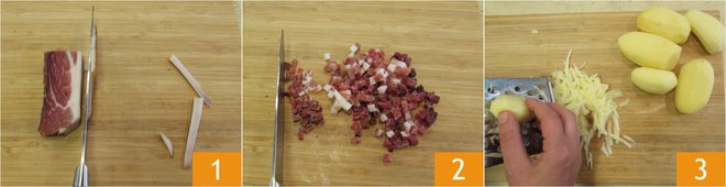 To prepare the potato and speck fritters, remove the rind 1 from the speck and dice it 2. Peel the potatoes and grate them using a coarse grater 3.