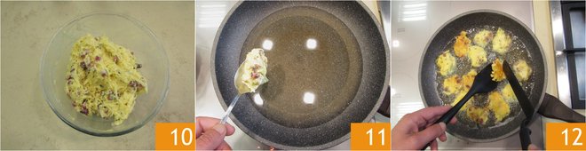 Mix everything to combine 10. Now pour the oil into a pan and heat it to a temperature of 320°F-340°F. Use 2 tablespoons to form the fritters 11. Fry for a couple of minutes, pressing them slightly, then turn them over and let the other side brown 12.