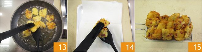 As they are ready, drain them 13 on a tray lined with paper towels 14. Enjoy the potato and speck fritters as soon as they are ready 15!