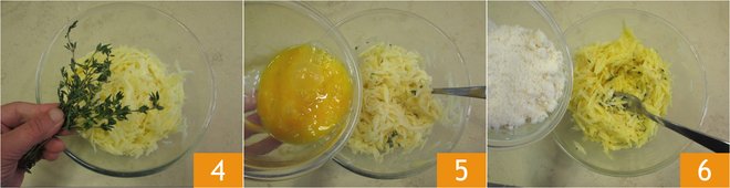 In a bowl, mix the potatoes, the thyme leaves 4, the eggs 5, and stir. Then add the Parmigiano Reggiano DOP 6.
