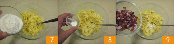 Also incorporate the flour 7 and the instant yeast 8. Finally, add the speck 9, and season with salt and pepper.
