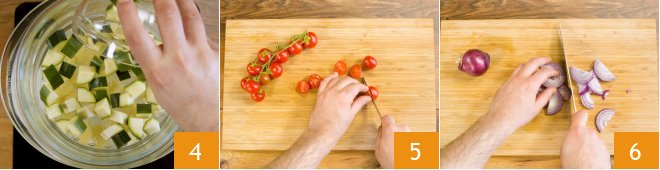 and the zucchini 4. Once cooked, let them cool slightly. Meanwhile, rinse the cherry tomatoes and cut them in half 5, then peel and slice the red onion 6.