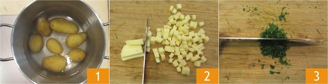 To make tuna and potato savory cake, start by placing the potatoes in a pan with cold water; boil them for around 40 minutes from when the water comes to the boil, depending on their size; check they are done by piercing them with a fork 1. In the meantime, dice the provola cheese 2 and finely chop the parsley 3.