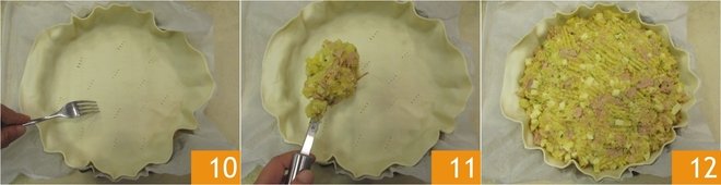 Place a puff pastry disc in an 11" mold lined with parchment paper and perforate the surface with a fork 10. Add the mixture 11 and smooth with the back of a spoon 12.
