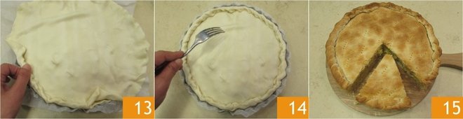 Cover with the second puff pastry disc and seal the edges by pressing them together and turning them inwards 13. Perforate the surface too 14; bake in a static oven preheated to 392? for around 40 minutes. Once baked, remove your tuna and potato savory cake and serve it hot or cold 15!