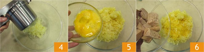 Once the potatoes are done, mash them in a bowl with a potato masher 4 and leave them to cool before adding the beaten eggs 5 and drained tuna 6.