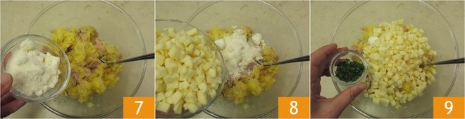 Add the grated Grana 7, the diced cheese 8 and finely chopped parsley 9. Season with salt and pepper, then stir thoroughly to amalgamate everything.