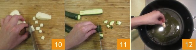 and bake in a preheated fan oven at 392°F (200°C) for 20 minutes. Meanwhile, cut the scamorza cheese into cubes 10, wash and trim the zucchini, then dice them 11. In a pan, pour the oil and add the unpeeled garlic clove 12,