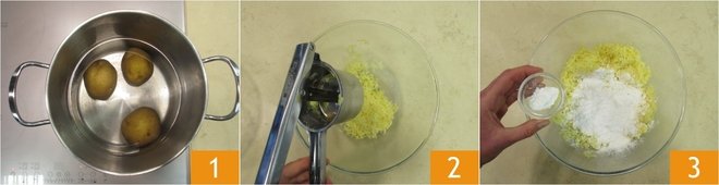 To make potato calzoni, boil the unpeeled potatoes until soft 1. Mash the potatoes while still hot using a potato masher, then place the puree in a large bowl 2. Add the potato starch and instant baking powder3.