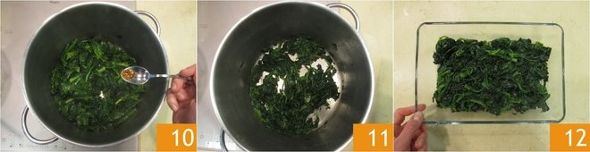 Add salt and flavor with the dry peperoncino 10. Stir and cook on a medium flame for around 10 minutes. When cooked 11, place the spinach in a baking tray and leave to cool 12.
