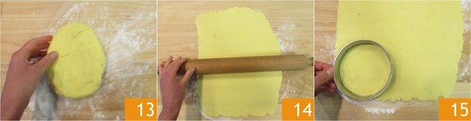 Roll the potato dough out on a pastry board lightly sprinkled with potato starch 13, until around 0.2 inches (1/2 cm) thick 14. Use a 4.3 inch (10 cm) diameter shaping ring mold to cut out 6 discs 15.