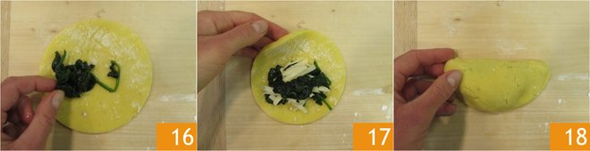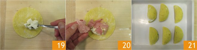 Fill the remaining discs with the diced mozzarella 19 and the prosciutto cotto 20. Close to form a crescent shape and seal thoroughly 21.