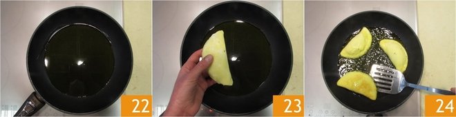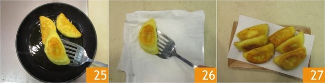 Drain the calzoni 25 and place them on a tray lined with absorbent paper 26. Serve the potato calzoni nice and hot 27!