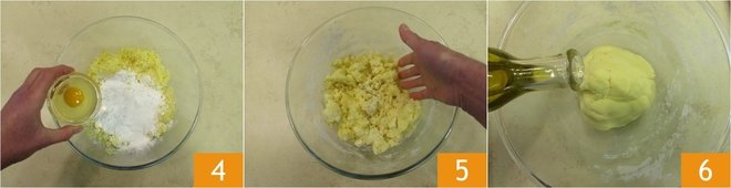 Now add an egg 4 and amalgamate the ingredients 5. Flavor with the salt and pepper and knead by hand until smooth and even. Lastly, add the oil 6.